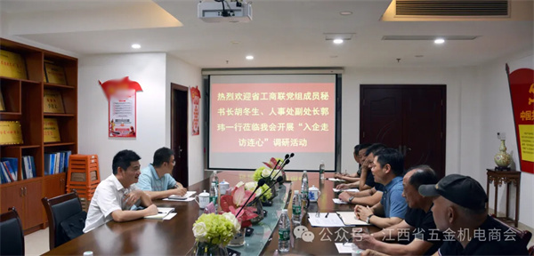 为深入学习贯彻党的二十届三中全会精神,切实将中央决策部署转化为推动民营经济高质量发展的强大动力。9月5日下午,省工商联党组成员、秘书长胡冬生一行莅临我会宣讲党的二十届三中全会精神,同时开展“入企走访连心”调研活动,倾听民企之声,共谋发展大计。省工商联人事处副处长郭玮陪同调研,我会书记/会长李省文、常务副会长兼秘书长石传义、常务副会长龚米根、谢文泽、熊忠平,办公室主任李佑平等相关人员参加活动。